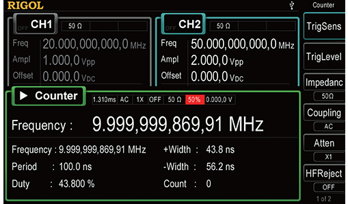 Die DG4000 Serie bietet eine 7-stellige Frequenzmessfunktion, die die Frequenz, die Periodendauer, den Tastgrad, die positive Pulsbreite, die negative Pulsbreite und andere Parameter des externen Eingangssignals messen kann und die Statistik der Messergebnisse unterstützt. Der Frequenzmesser kann gleichzeitig mit der Dualkanalausgabe arbeiten.