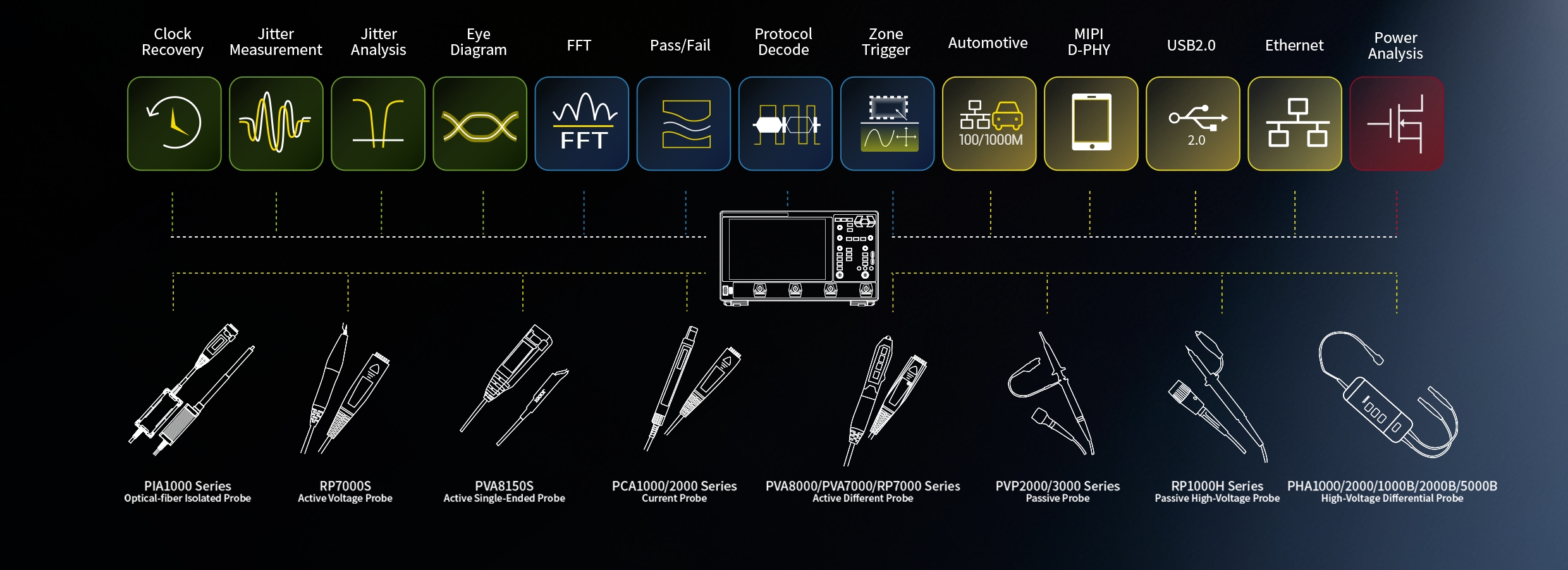 Combined with a 10.1-inch HD touchscreen and advanced capabilities such as eye diagram analysis, jitter decomposition, compliance testing, and powver analysis, the MSO/DS9000 Series is well suited for high-speed bus debugging, signal integrity analysis, power testing and compliance validation, delivering a more reliable, flexible, aand cost-efficient test experience.