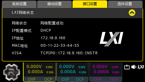 在接口设置界面点击 LXI 网络状态 打开下图所示的网络状态参数界面。再次点击 LXI 网络状态 ,可以折叠关闭当前界面回到接口设置界面。
