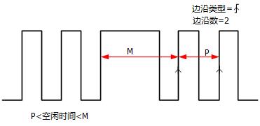 在指定空闲时间后第N个边沿上触发。例如,在如下图所示的波形中,需在指定空闲时间(相邻两个上升沿之间的时间)后第2个上升沿上触发,则空闲时间需设置为P<空闲时间<M。其中M为第1个上升沿与前一个上升沿之间的时间,P为参与计数的上升沿之间的最大时间。