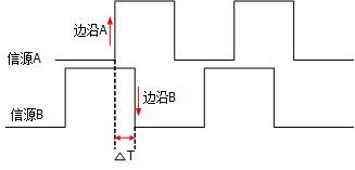延迟触发类型下,您需要设置触发信源A和信源B。当信源A所设定的边沿(边沿A)与信源B所设定的边沿(边沿B)之间的时间差(∆T)满足预设的时间限制时,示波器触发,其中边沿A与边沿B必须为紧邻的边沿。如下图所示。