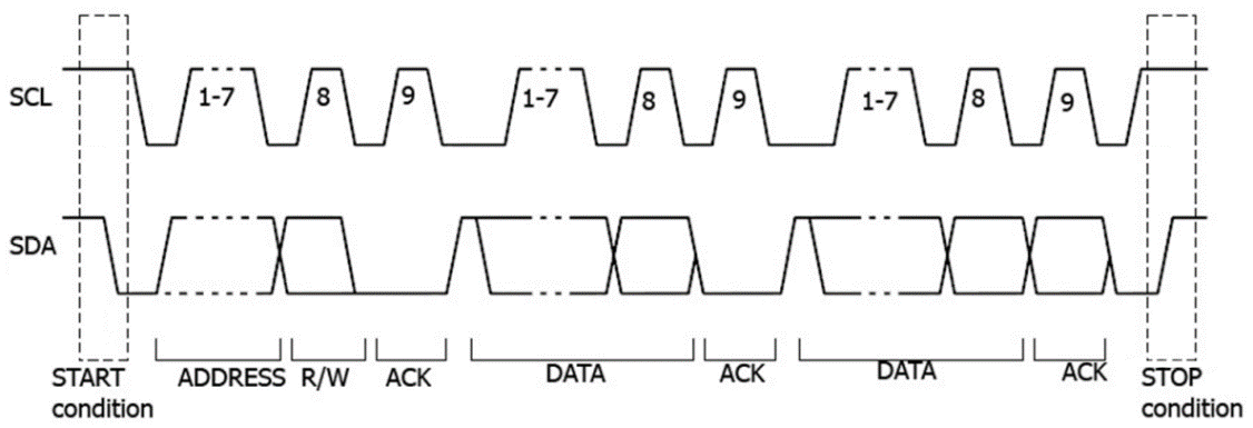 I2C串行总线由SCL、SDA两条线组成,传输速率由时钟线SCL决定,传输数据由数据线SDA决定,如下图所示。仪器可在启动、重启、停止、丢失确认、特定的设备地址或数据值上触发,也可在同时指定设备地址值和数据值时触发。