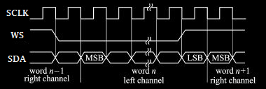 I2S触发类型下,示波器通过查找指定的数据值作为识别触发的条件,需指定串行时钟线(SCLK,每发送1位数字音频数据,时钟线上有1个脉冲)、帧时钟线(WS,用于切换音频声道数据)和串行数据线(SDA,用于传输二进制补码表示的音频数据)。