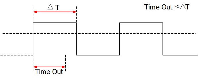 超时触发类型下,从输入信号的上升沿(或下降沿)跨过触发电平开始到相邻的下降沿(上升沿)跨过触发电平结束的时间间隔(∆T)大于设置的超时时间时,示波器触发,如下图所示。