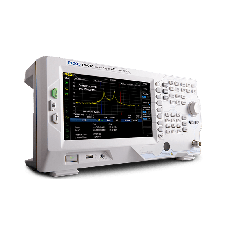 ASK/FSK modulation is usually used for car remote control keys, TPMS tire pressure modules and small wireless modules. The DSA700 can perform ASK/FSK signal capture through the SSC-DSA function extension, and has built-in 2FSK test function to directly obtain parameters such as center frequency, power and offset.