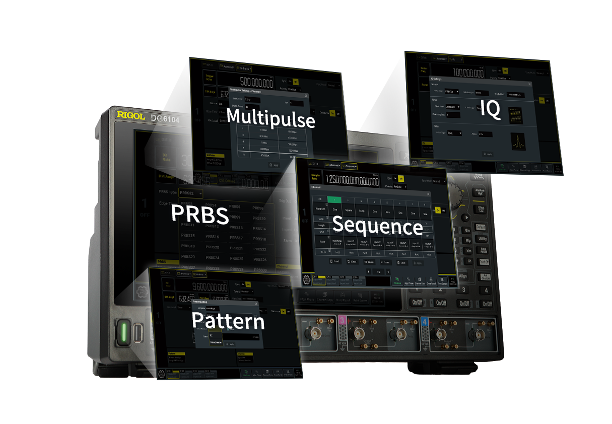 DG6000은 Sequence, PRBS, Multi-tone, Pattern, Multi-pulse, IQ 변조 등 다양한 고급 신호 생성 기능을 기본으로 제공합니다.