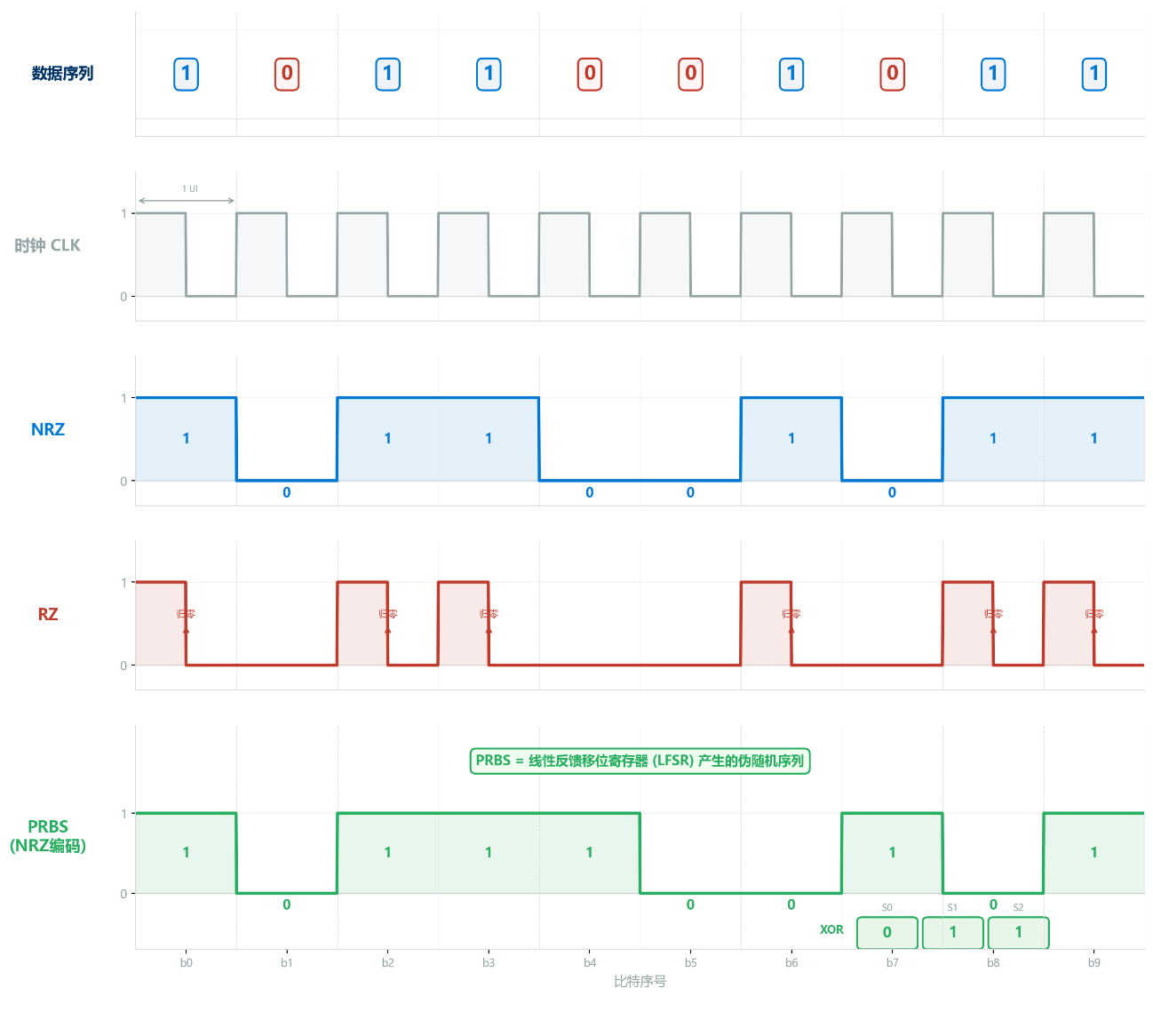 | PRBS15 | 215 - 1 = 32,767 bit | PCIe/JESD204 测试 |