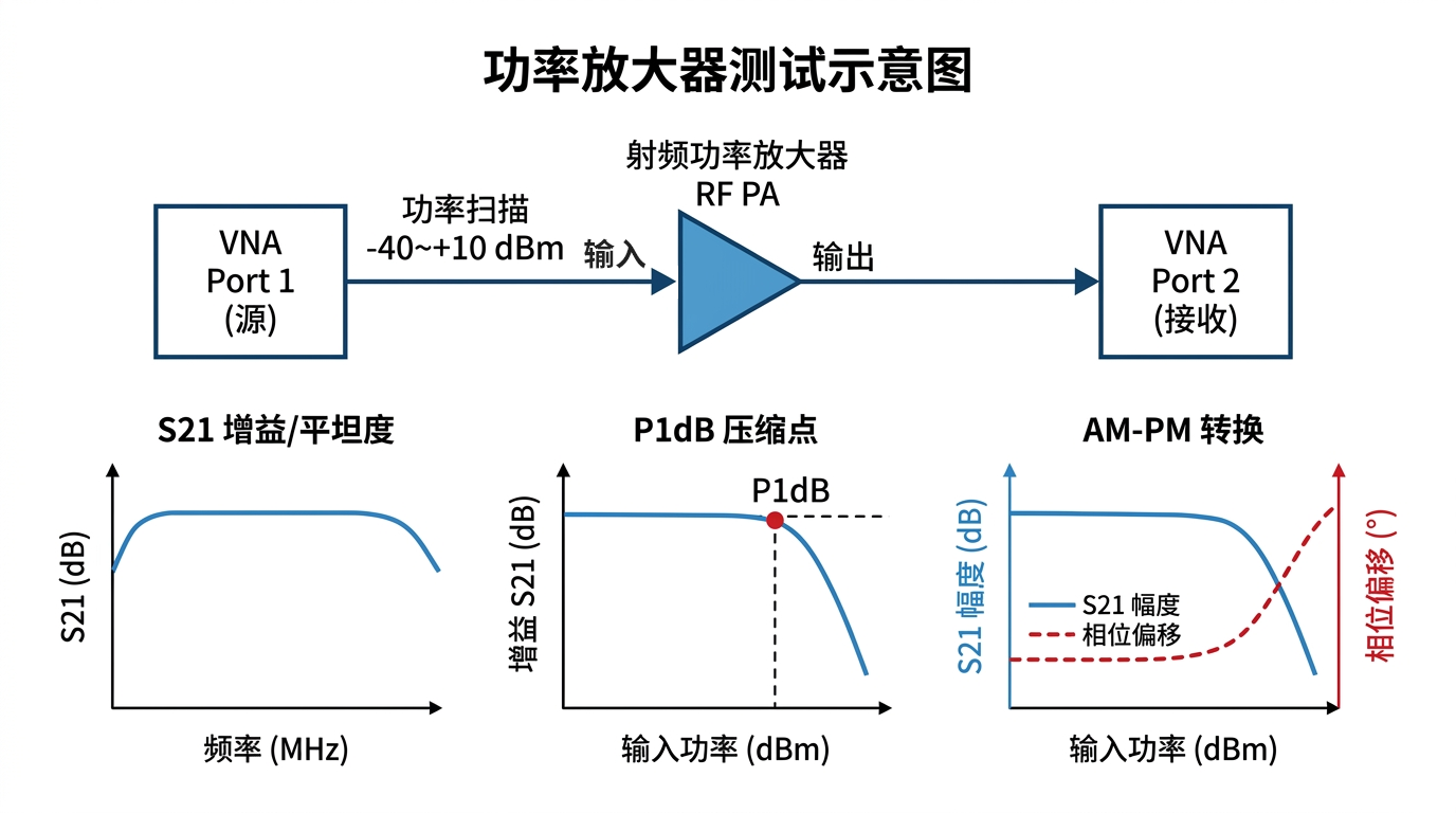 应对挑战3 & 4:功率扫描一次完成P1dB + AM-PM矢量测量