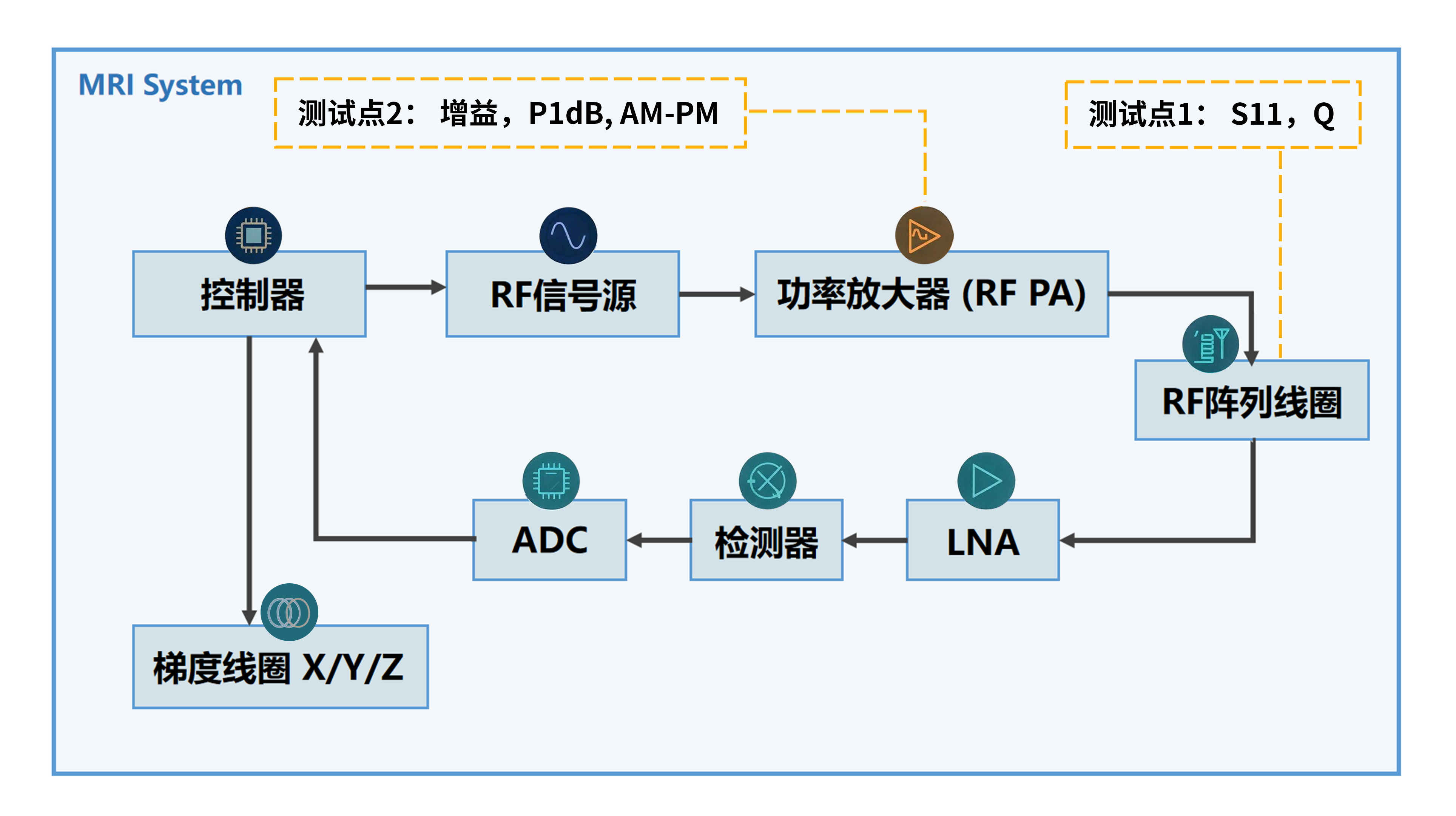 在这条链路中,射频线圈和射频功率放大器是两个需要精密射频测试的核心器件——它们的性能直接决定了MRI的成像质量。