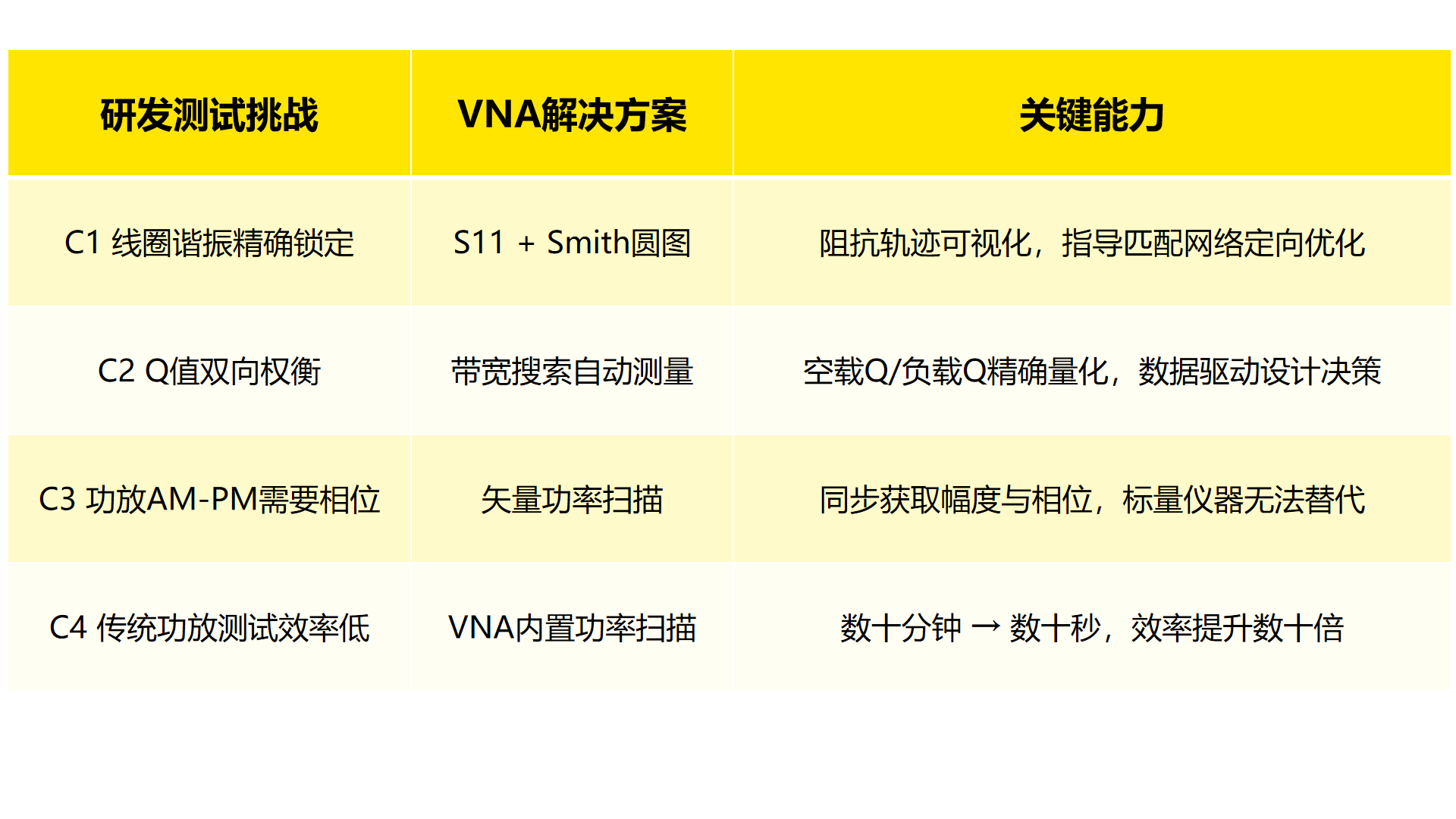 VNA的史密斯圆图模式直观展示线圈在宽频范围内的阻抗轨迹,帮助工程师快速判断匹配网络的电容电感取值方向,将原本反复盲调的过程转变为有据可循的定向优化。