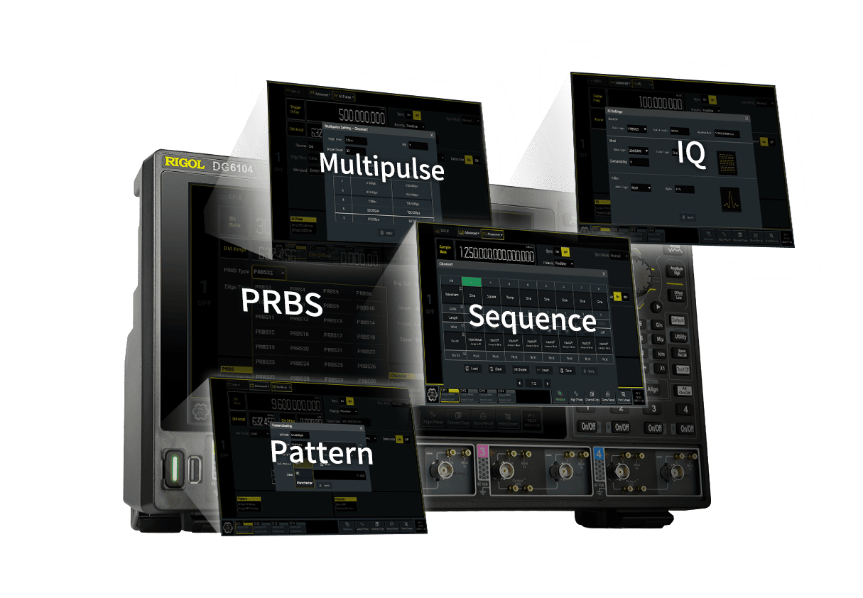 10.1英寸高清触摸屏,支持多点触控与拖拽操作,参数配置如平板般丝滑。内置 240+ 种 任意波形,支持 IQ 调制、多脉冲、PRBS 码型生成。无论是实验室的精密研发,还是产线的自动化测试,DG6000 系列函数/任意波形发生器都能从容应对。
