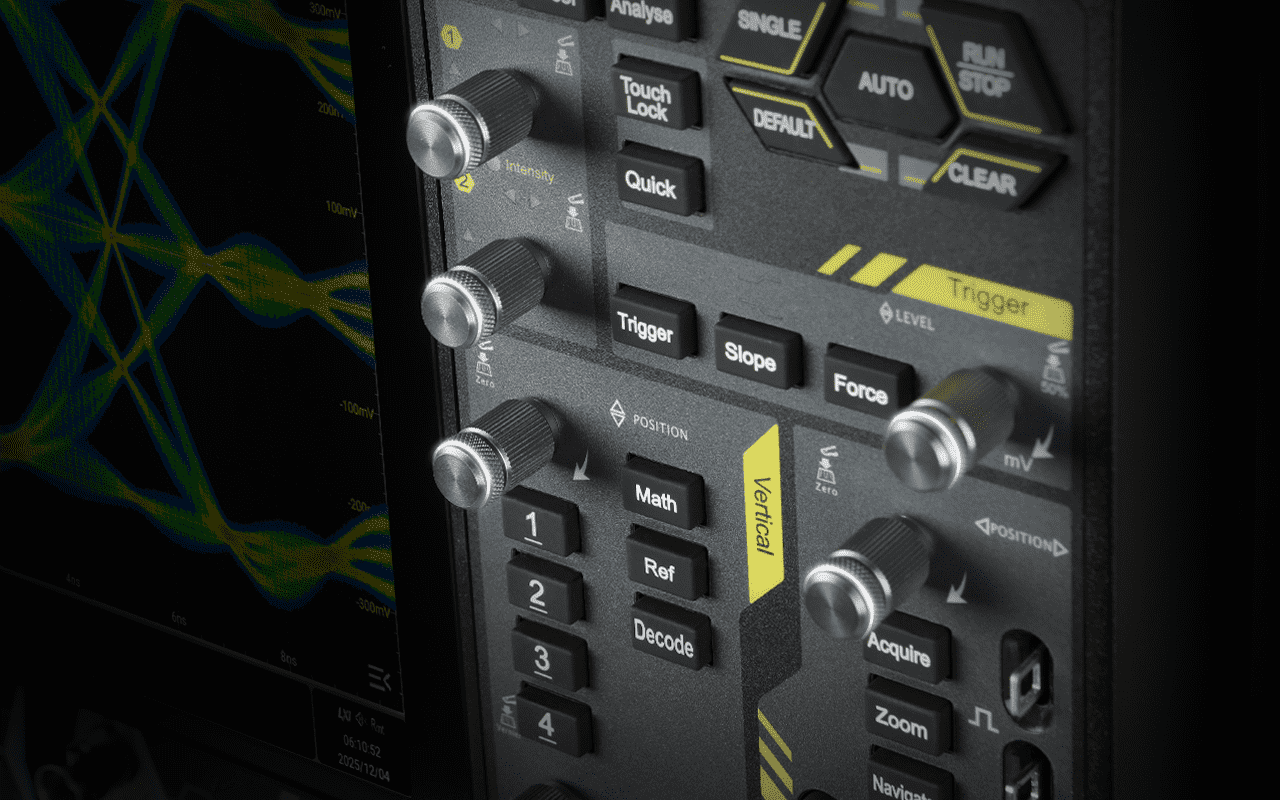 - 4GHz模拟带宽,20GSa/s实时采样率:五倍过采样能够有效捕捉高速信号的瞬态变化,满足高速信号调试与复杂前沿应用需求。