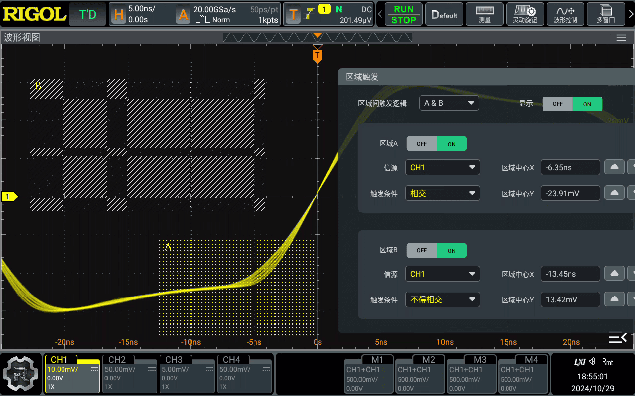 - 智能触发: 全方位的触发系统,除标准触发外,更提供 蒙板测试 和 区域触发。只需在屏幕上画出区域,即可精准锁定异常信号。