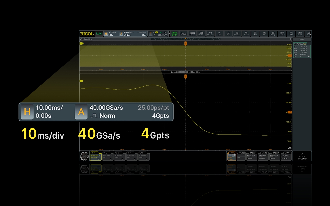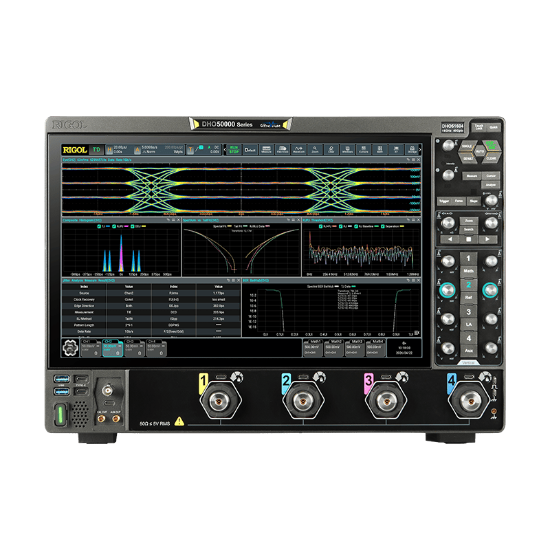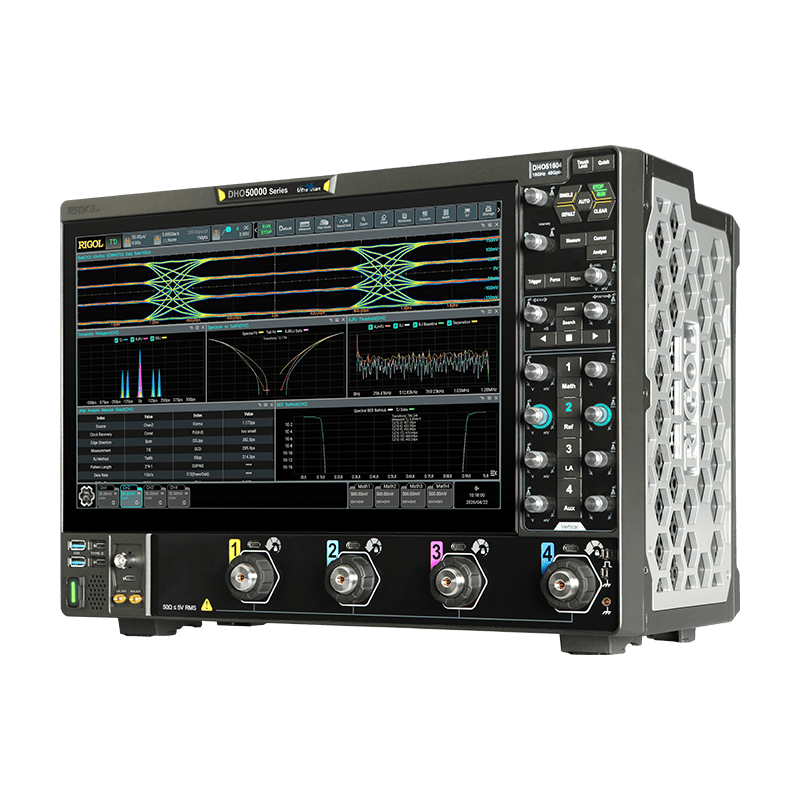 DHO50000 系列高分辨率数字示波器是 RIGOL 面向高速测试领域的重磅力作。在核心性能方面,该产品融合了高达 16GHz 的模拟带宽与 12bit 原生垂直分辨率,配合全通道 40GSa/s 的实时采样率与 4Gpts 大容量深存储,为高保真信号的捕获奠定了坚实基础;在体验设计方面,创新搭载的固态电子衰减器实现了无磨损、无噪音的切换,结合 198mm 的紧凑型纤薄机身,大幅优化了桌面级测试的交互体验;在应用生态方面,依托完善的原生差分探头生态与丰富的高级分析功能,致力于为工程师在复杂的多路高速信号验证中,提供精准、高效且可靠的全面测试方案。