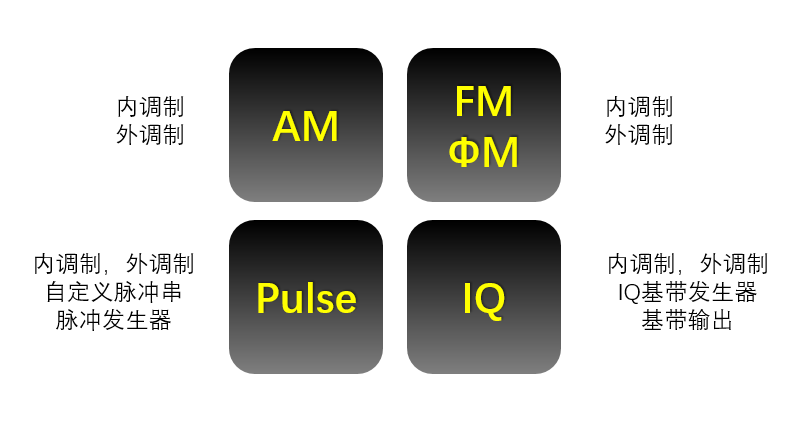 标配调幅,调频,调相等模拟调制方式以及脉冲调制和脉冲发生器,可选可用户自定义的脉冲序列,以及I/Q调制和IQ基带发生器,可生成QAM、ASK、PSK、FSK、MSK等各种常用的调制信号;所有调制都支持内部和外部调制源